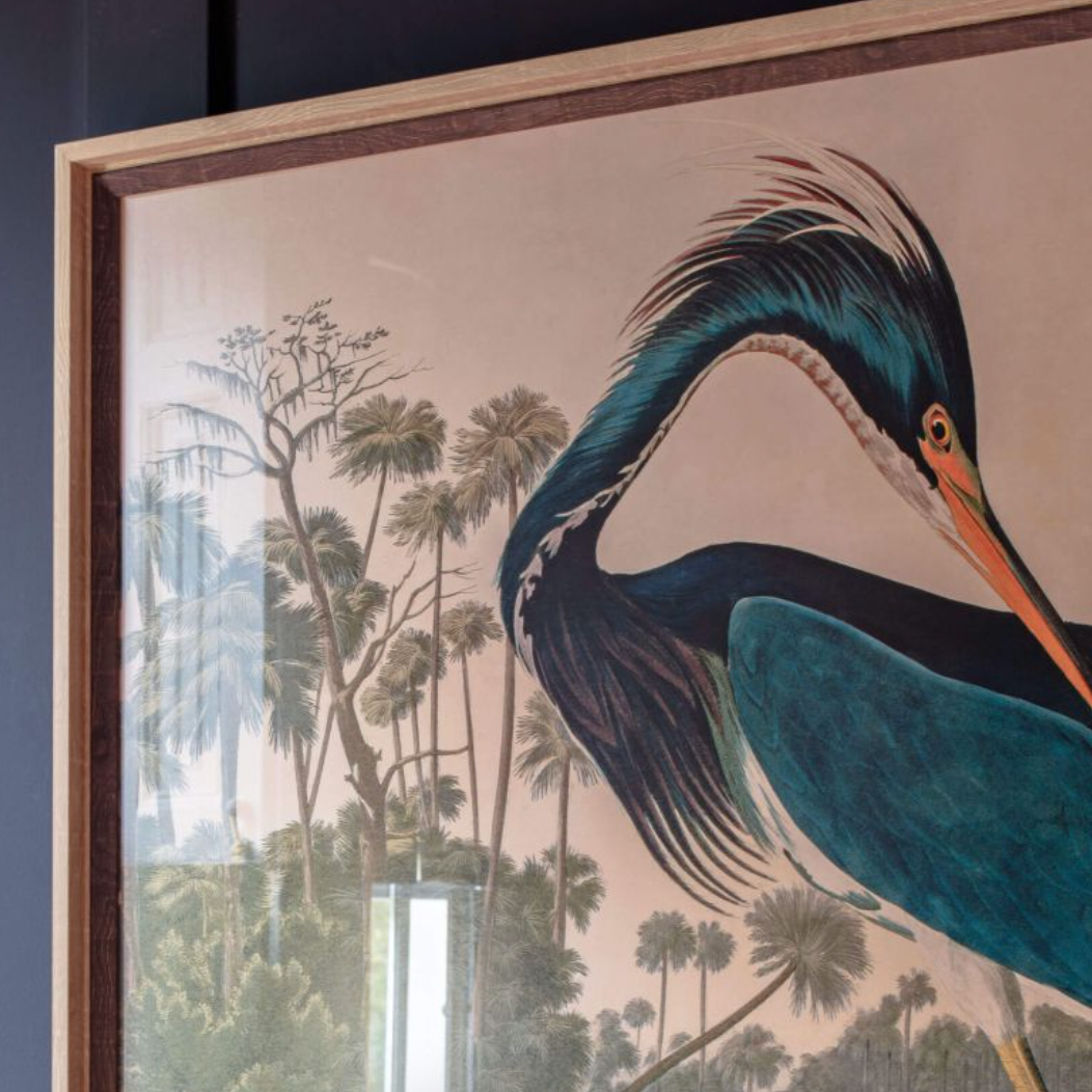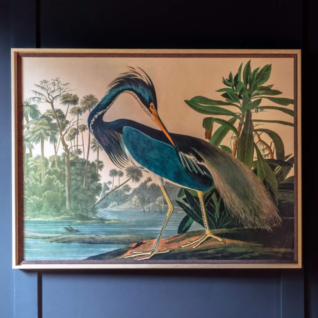 Inspired by the work of Audubon, this large landscape print features a dark black heron in its natural habitat to decorate your natural habitat. An oversized piece of art with a much-loved aged appearance, just like a Victorian vintage illustration.